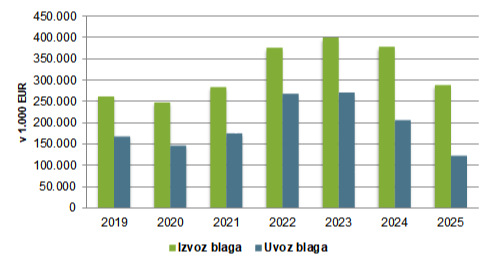 Blagovna menjava med Slovenijo in Bolgarijo 2019 – 2025 (grafični prikaz)