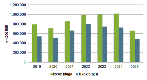 Blagovna menjava med Slovenijo in Bosno in Hercegovino 2019 – 2025 (grafični prikaz)