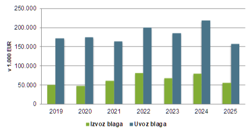 Blagovna menjava med Slovenijo in Brazilijo 2019 – 2025 (grafični prikaz)