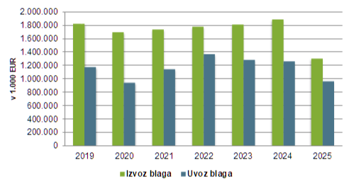 | Leto | Izvoz blaga | Uvoz blaga | Skupaj | Saldo |