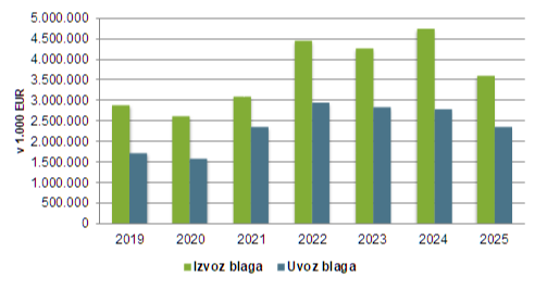 | Leto | Izvoz blaga | Uvoz blaga | Skupaj | Saldo |