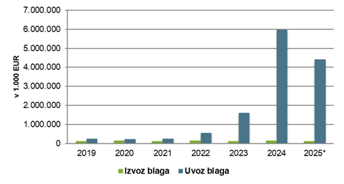 Blagovna menjava med Slovenijo in Indijo 2019 – 2025 (grafični prikaz)