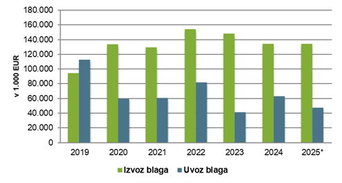 | Leto | Izvoz blaga | Uvoz blaga | Skupaj | Saldo |