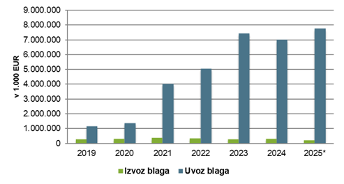Blagovna menjava med Slovenijo in Kitajsko 2019 – 2025 (grafični prikaz)