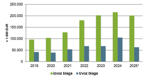 | Leto | Izvoz blaga | Uvoz blaga | Skupaj | Saldo |