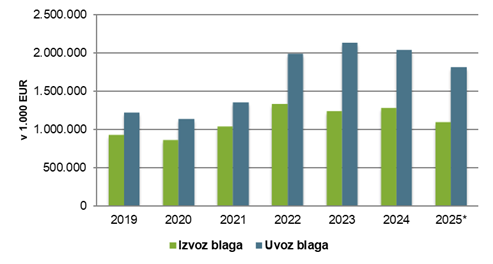 Blagovna menjava med Slovenijo in Madžarsko 2019 – 2025 (grafični prikaz)