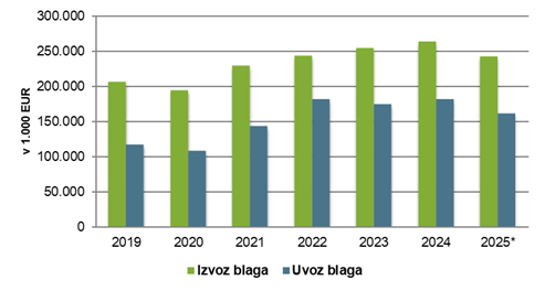 Blagovna menjava med Slovenijo in Severno Makedonijo 2019– 2025 (v 1.000 EUR)