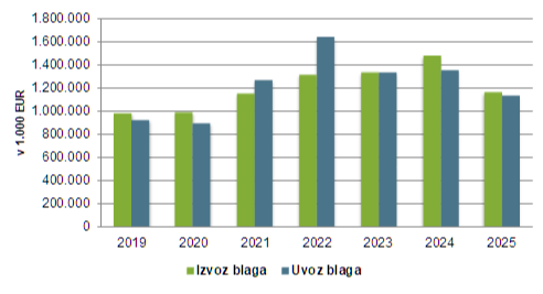 Blagovna menjava med Slovenijo in Poljsko 2019 – 2025 (v 1.000 EUR)