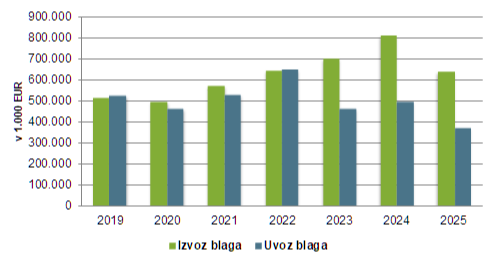 Blagovna menjava med Slovenijo in Romunijo 2019 – 2025 (grafični prikaz)
