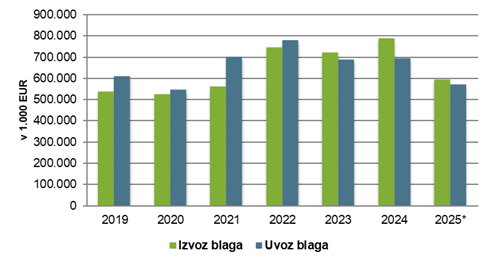 Blagovna menjava med Slovenijo in Slovaško 2019 – 2025 (grafični prikaz)