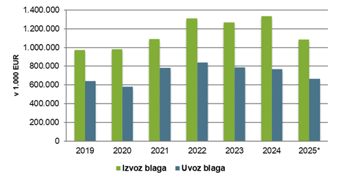 Slovenija je v letu 2024 v Srbijo izvozila za 1.332 mio EUR blaga, uvozila pa ga je za 765 mio EUR.