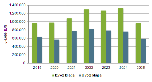 Blagovna menjava med Slovenijo in Srbijo 2019 – 2025 (v 1.000 EUR)