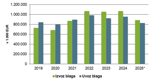 Blagovna menjava med Slovenijo in Češko republiko 2019 – 2025 (grafični prikaz)