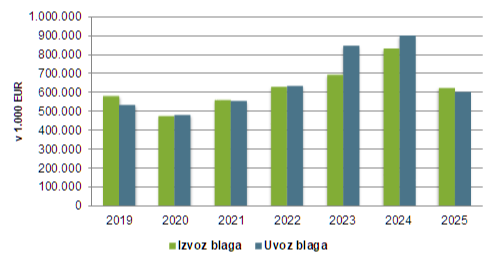 | Leto | Izvoz blaga | Uvoz blaga | Skupaj | Saldo |
