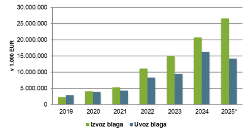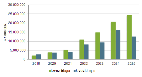 | Leto | Izvoz blaga | Uvoz blaga | Skupaj | Saldo |