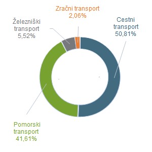 Segmentacija globalnega trga transportnih storitev glede na način transporta (v %, za leto 2024)
