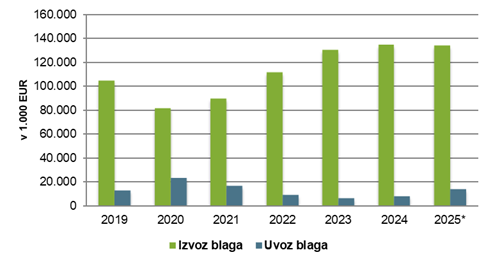 | Leto | Izvoz blaga | Uvoz blaga | Skupaj | Saldo |