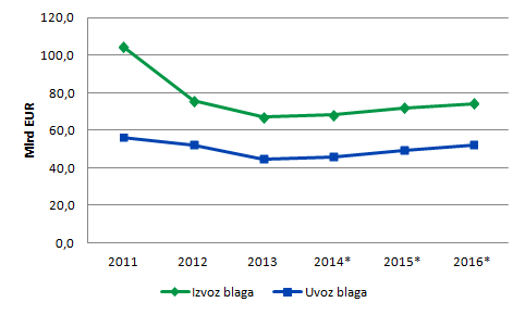 Iran - gibanje izvoza in uvoza blaga 2011 - 2016 (grafični prikaz)