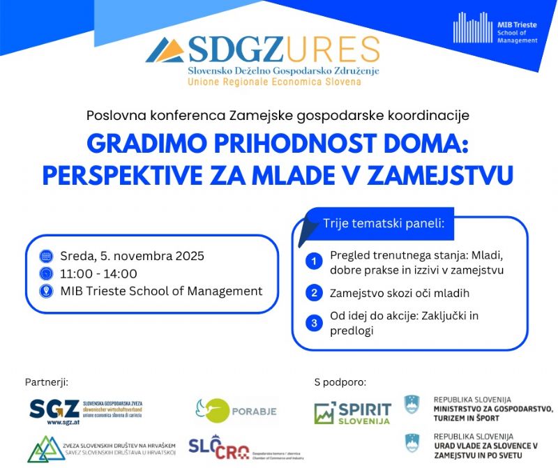 SDGZ Slovensko deželno gospodarsko združenje organizira v sklopu Poslovne konference Zamejske gospodarske koordinacije dogodek z naslovom Gradimo prihodnost doma: Perspektive za mlade v zamejstvu. Dogodek bo potekal v sredo, 5. novembra 2025, od 11. ure, v konferenčni dvorani Generali, MIB Trieste School of Management (Largo Caduti di Nassiriya 1, Trst, Italija).