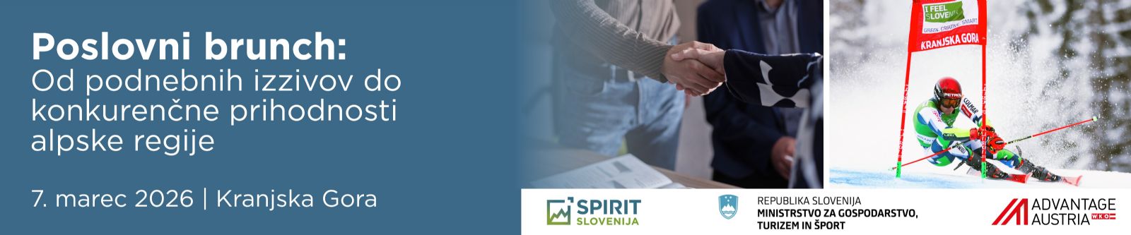Javna agencija SPIRIT Slovenija tudi letos prepoznava mednarodne zimske športne dogodke kot priložnost za krepitev poslovnih povezav in mreženje. Skupaj z Advantage Austria vas 7. marca 2026 v okviru 65. svetovnega pokala v alpskem smučanju Vitranc prijazno vabimo na poslovni brunch v Kranjsko Goro.