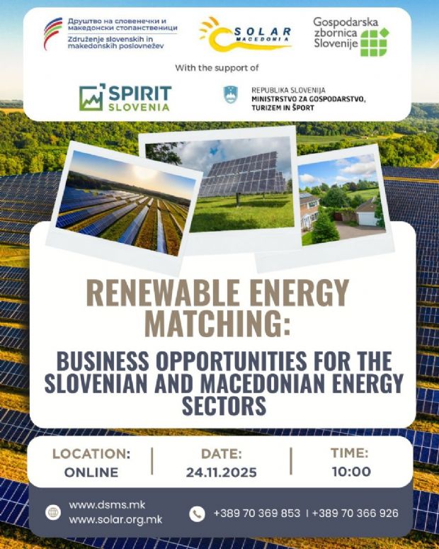 Društvo slovenskih in makedonskih poslovnežev, Makedonsko združenje za sončno energijo - Solar Macedonia in Gospodarska zbornica Slovenije vabijo k udeležbi na spletnem seminarju z naslovom: Povezovanje na področju obnovljive energije: poslovne priložnosti za slovenski in makedonski energetski sektor.