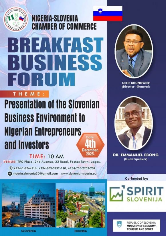 Slovenski poslovni klub v Nigeriji ˝Nigeria-Slovenia Chamber of Commerce LTD/GTE˝ organizira poslovni dogodek - Predstavitev slovenskega gospodarstva nigerijskim podjetnikom in investitorjem.