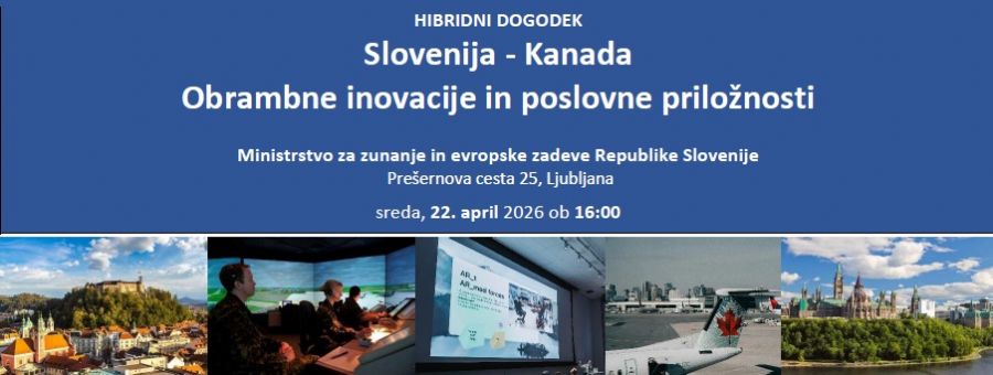 V sredo, 22. aprila 2026 ob 16:00 bo v prostorih Ministrstva za zunanje in evropske zadeve (Prešernova cesta 25, Ljubljana) potekal dogodek z naslovom: Slovenija - Kanada: Obrambne inovacije in poslovne priložnosti.