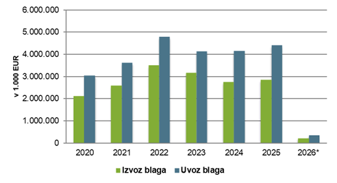 Blagovna menjava med Slovenijo in Avstrijo 2020 – 2026 (v 1.000 EUR)