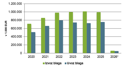 | Leto | Izvoz blaga | Uvoz blaga | Skupaj | Saldo |