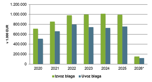 Blagovna menjava med Slovenijo in Bosno in Hercegovino 2020 – 2026 (grafični prikaz)