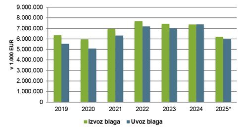 Blagovna menjava med Slovenijo in Nemčijo 2019 – 2025 (grafični prikaz)