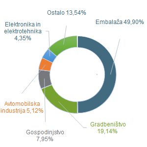 Največji delež trga plastike je leta 2024 predstavljal segment embalaže, ki je z 1,78 mio tonami dosegel skoraj polovico celotnega obsega trga (49,9 %). Gradbeništvo je v istem letu prispevalo 680.800 ton, oziroma 19,1 % celotne porabe.Prevladovanje segmenta embalaže je posledica njegovih funkcionalnih prednosti, stroškovno učinkovite proizvodnje in tehnološkega napredka, ki omogoča uporabo manjših količin plastike brez poslabšanja kakovosti embalaže. Hitro širjenje e-trgovine je povečalo potrebo po zanesljivi in zaščitni embalaži za varno dostavo izdelkov, pri čemer plastika ostaja najpogosteje uporabljena rešitev.