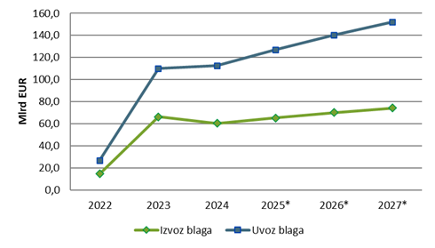| Uvoz blaga (v mlrd EUR): | -140,2 | -126,9 | -112,6 | -109,9 | -26,8 |