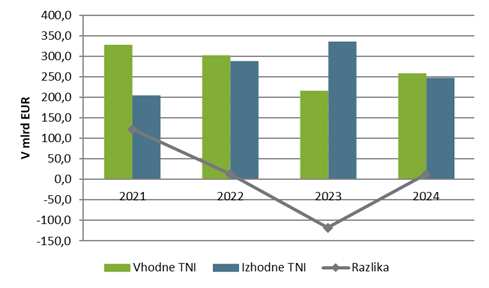 - Celotne izhodne TNI ZDA so v letu 2024 znašale 9.014,9 mlrd EUR, povprečna letna stopnja rasti izhodnih TNI od leta 2020 pa je znašala 4,7 %.
