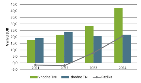 - Celotne izhodne TNI ZAE so v letu 2024 znašale 263,9 mlrd EUR, povprečna letna stopnja rasti izhodnih TNI od leta 2020 pa je znašala 12,1 %.